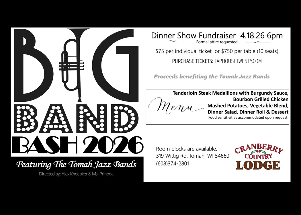 Big Band Bash 2026 April 18 2026 | 5:00 PM - 10:00 PM 319 Wittig Rd, Tomah, WI 54660 Purchase Tickets $750.00 Please, select a ticket type Ticket Type* Ticket Type Table of 10 - $750.00 Single Tickets - $75.00 Please, enter a valid first name First Name* Please, enter a valid last name Last Name* Please, enter a valid email Email* Add Ticket To Cart Please check errors in the form above.